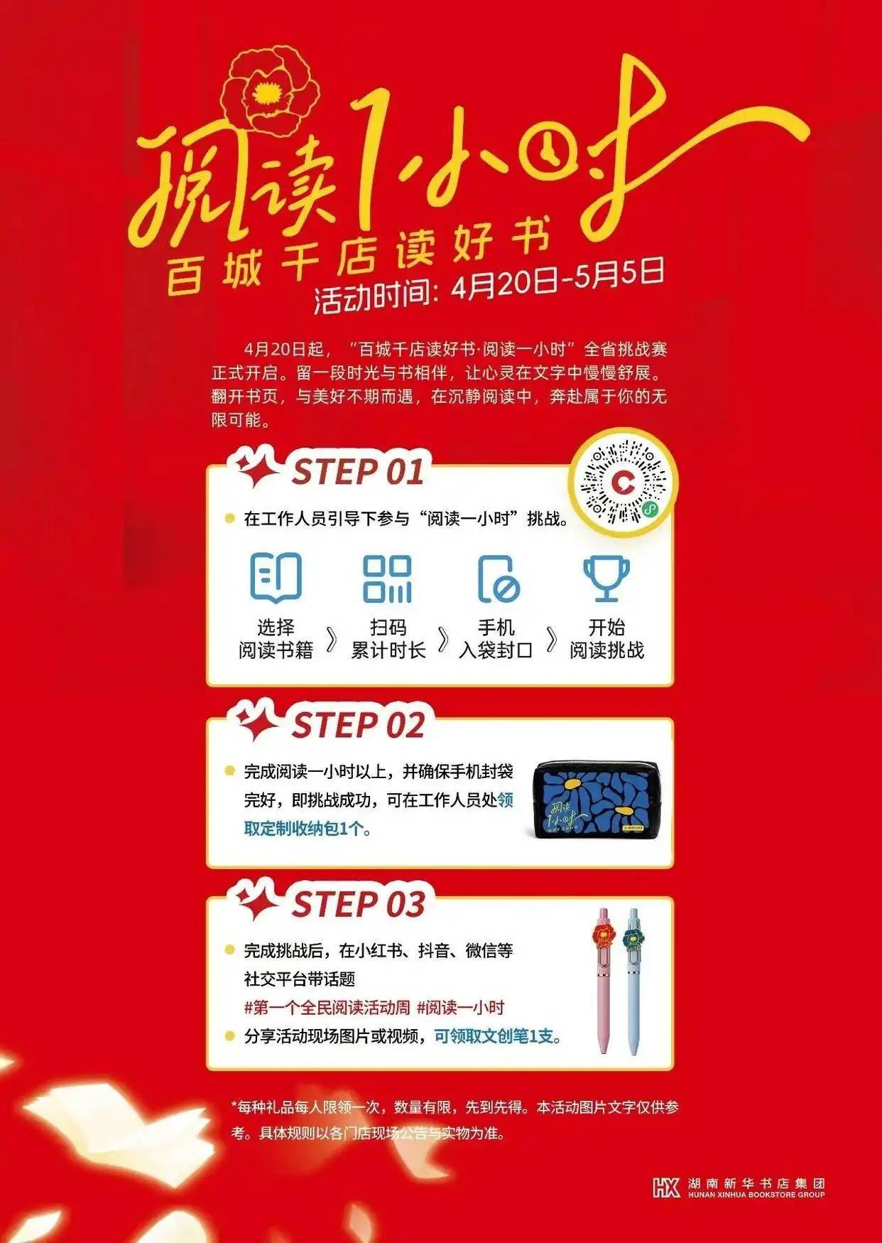 湖南新华书店集团“阅读一小时”活动,不仅为市民提供了静心读书的场景,更以轻松、可参与的形式,推动全民阅读走向日常、走进家庭。本次活动将持续至5月5日,欢迎更多爱书人来到湖南新华书店集团117家门店进行挑战打卡。